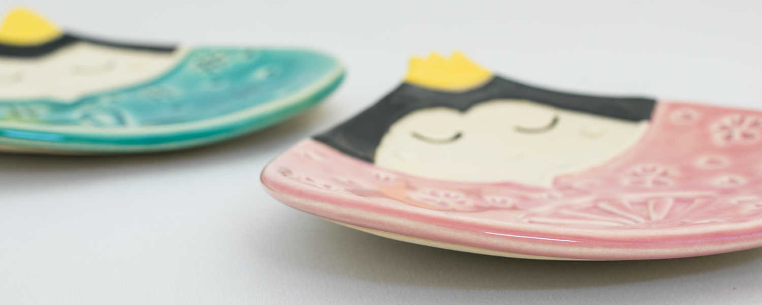 青色と桃色のガラス質の釉を使います。