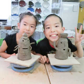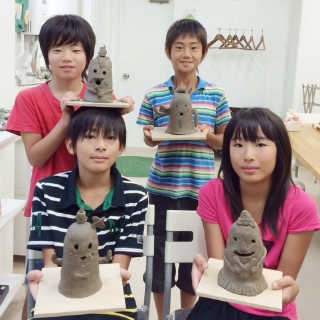 小さなお子様はひも土づくり、大人は型に巻きつけて分業、顔のパーツはいっしょにひっつけて楽しみましょう。