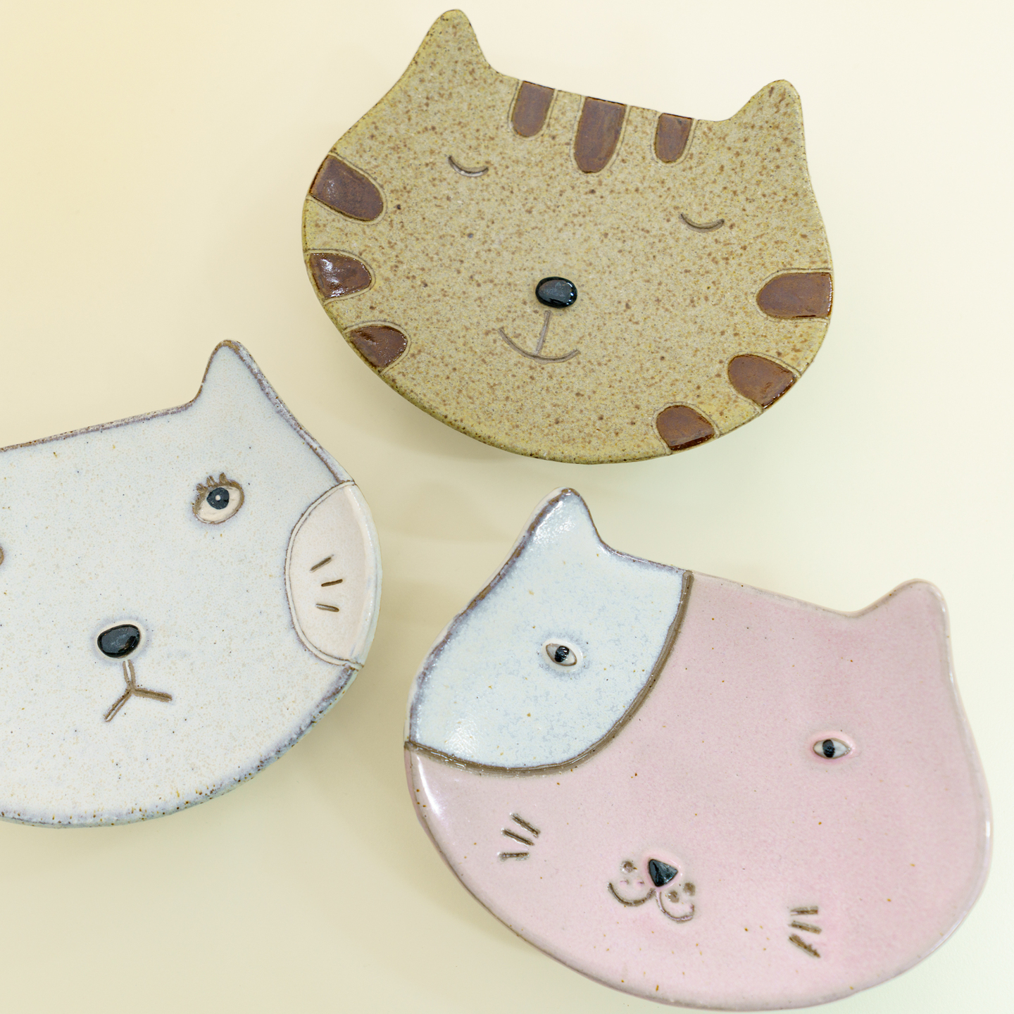 ねこ皿の最大のポイントは、釉薬の重ね掛けや掛け分けといった、複雑な工程の仕上げが7種類から選べます!同じ顔つきで作っても、違うネコになります