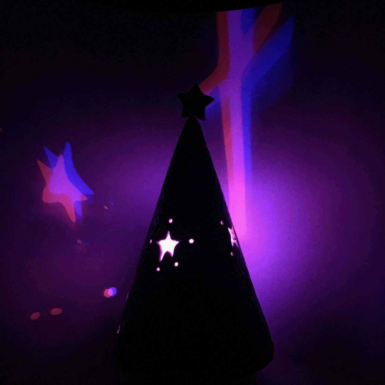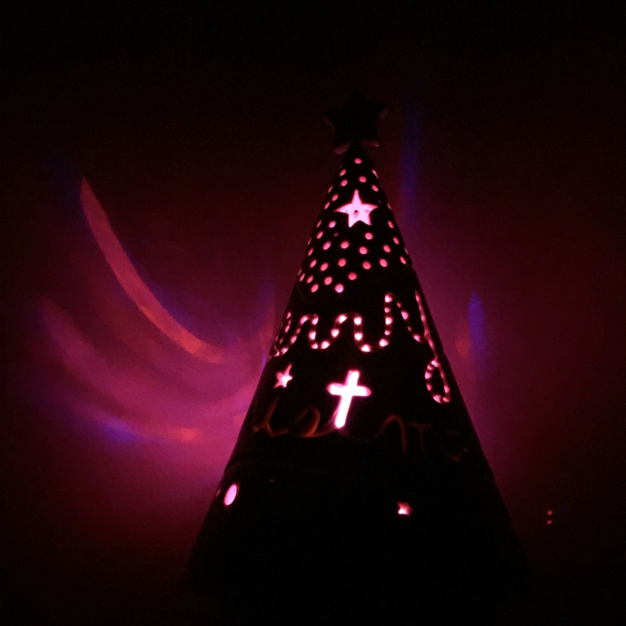 台の上にLEDライトを置き、ツリーをかぶせて置きます。