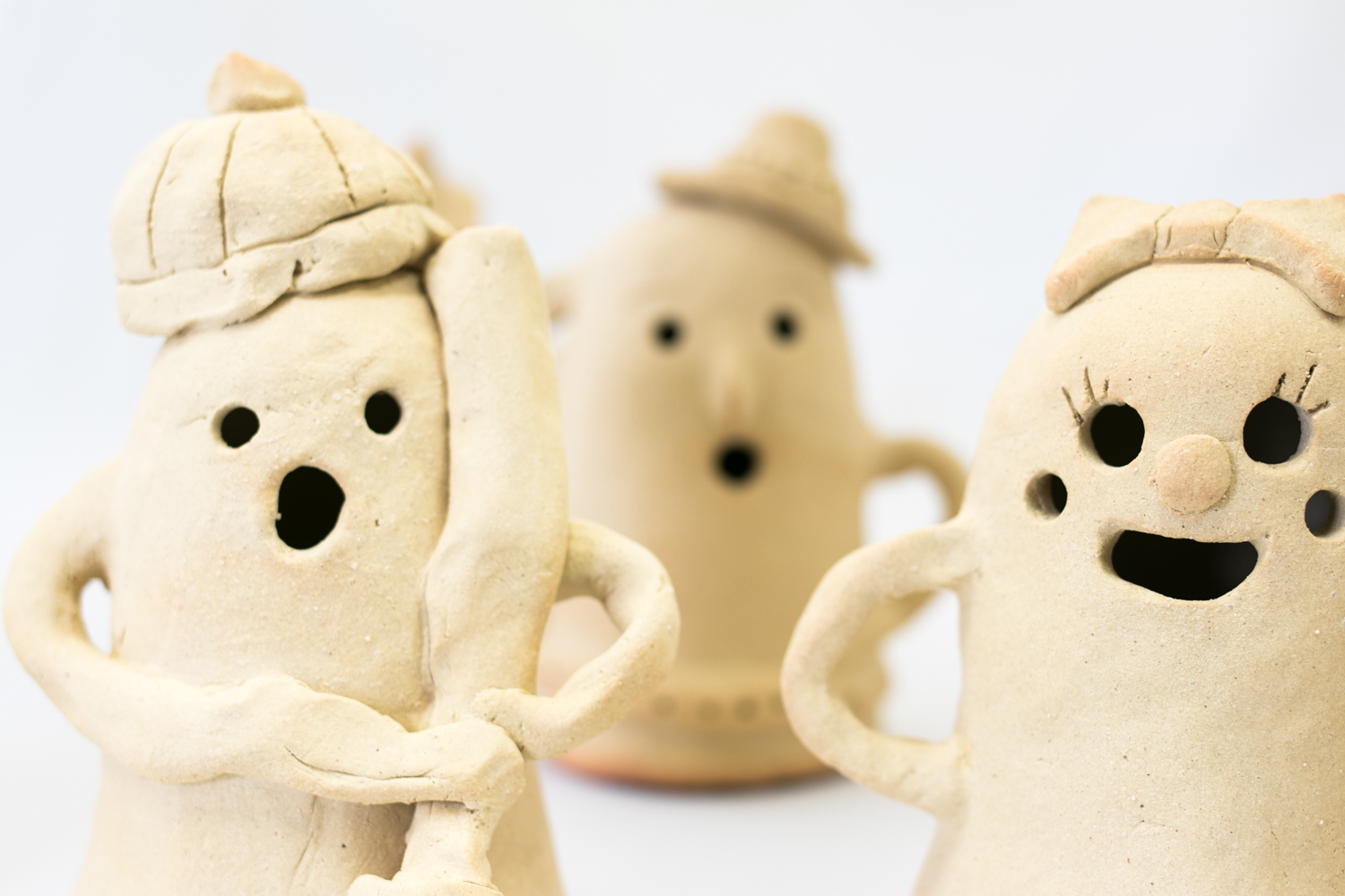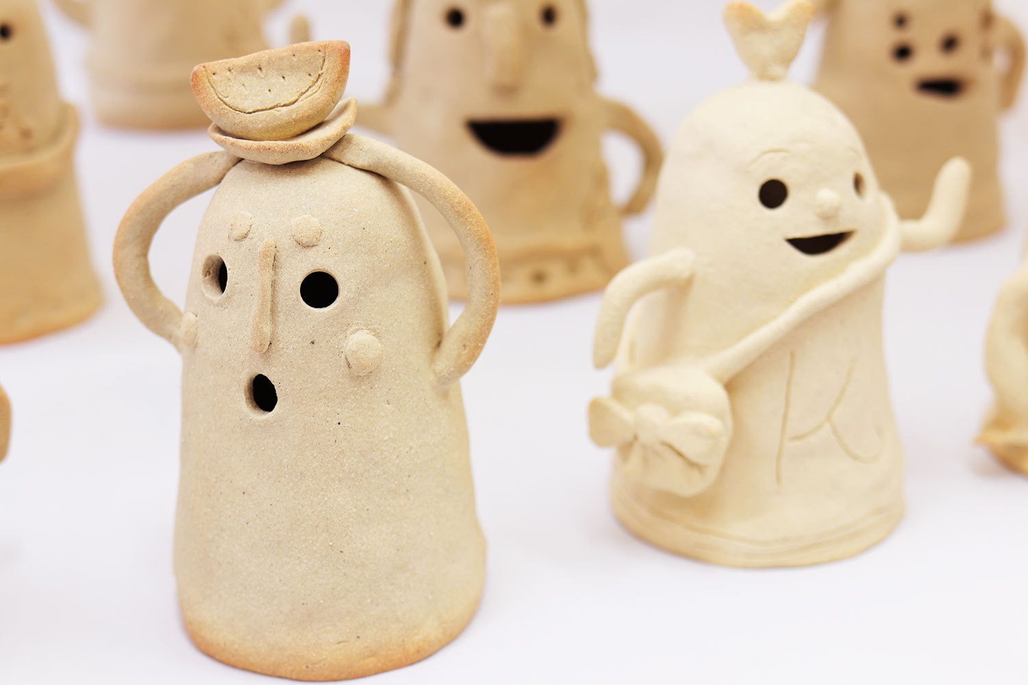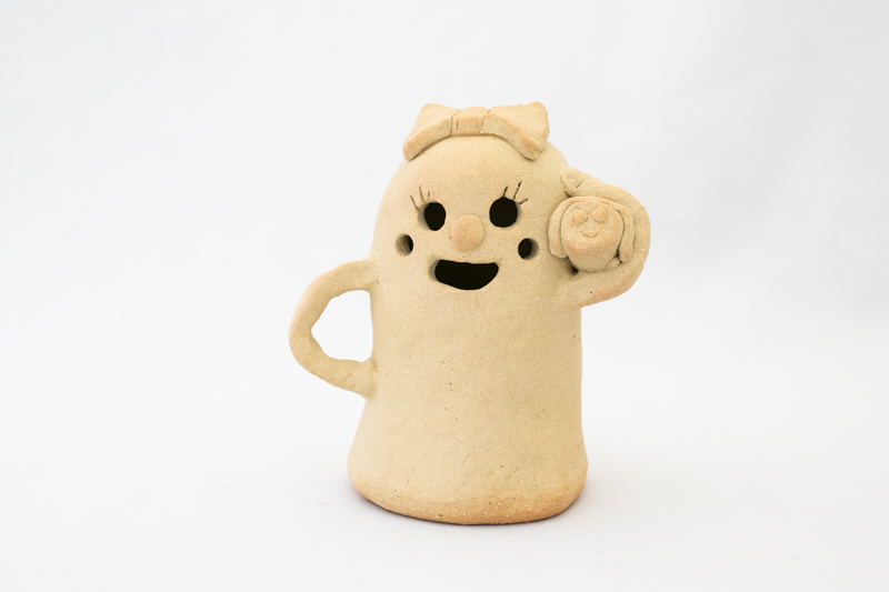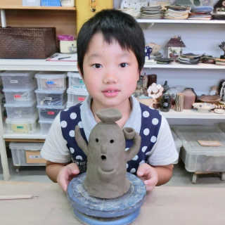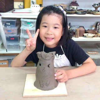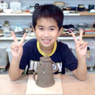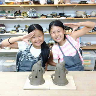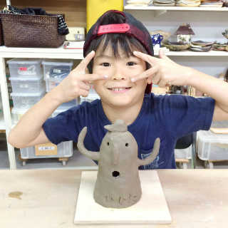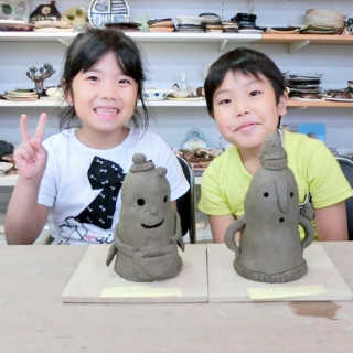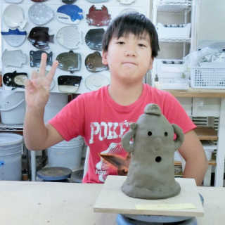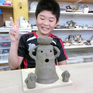 小さなお子様はひも土づくり、大人は型に巻きつけて分業、顔のパーツはいっしょにひっつけて楽しみましょう。