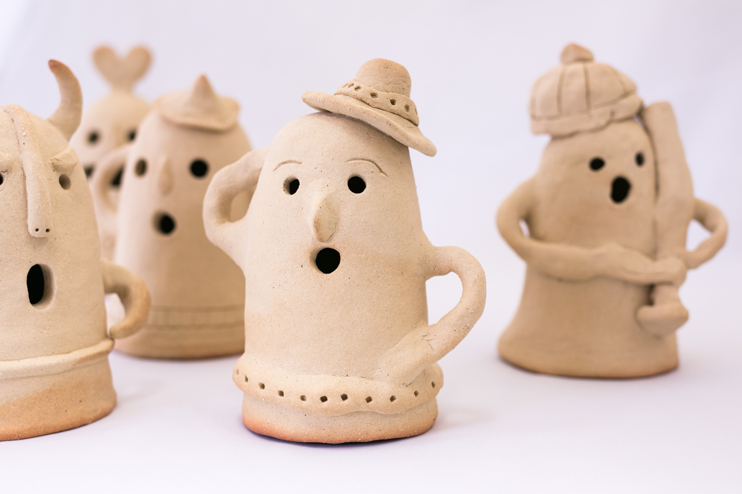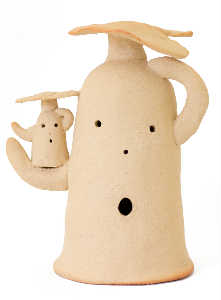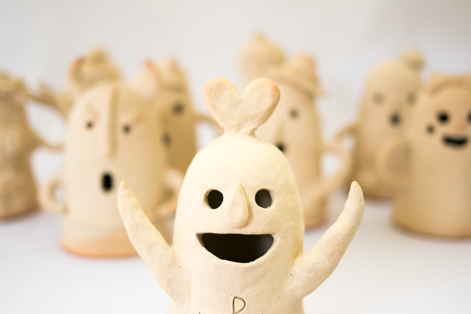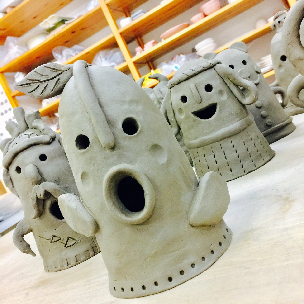 小さなお子様はひも土づくり、大人は型に巻きつけて分業、顔のパーツはいっしょにひっつけて楽しみましょう。