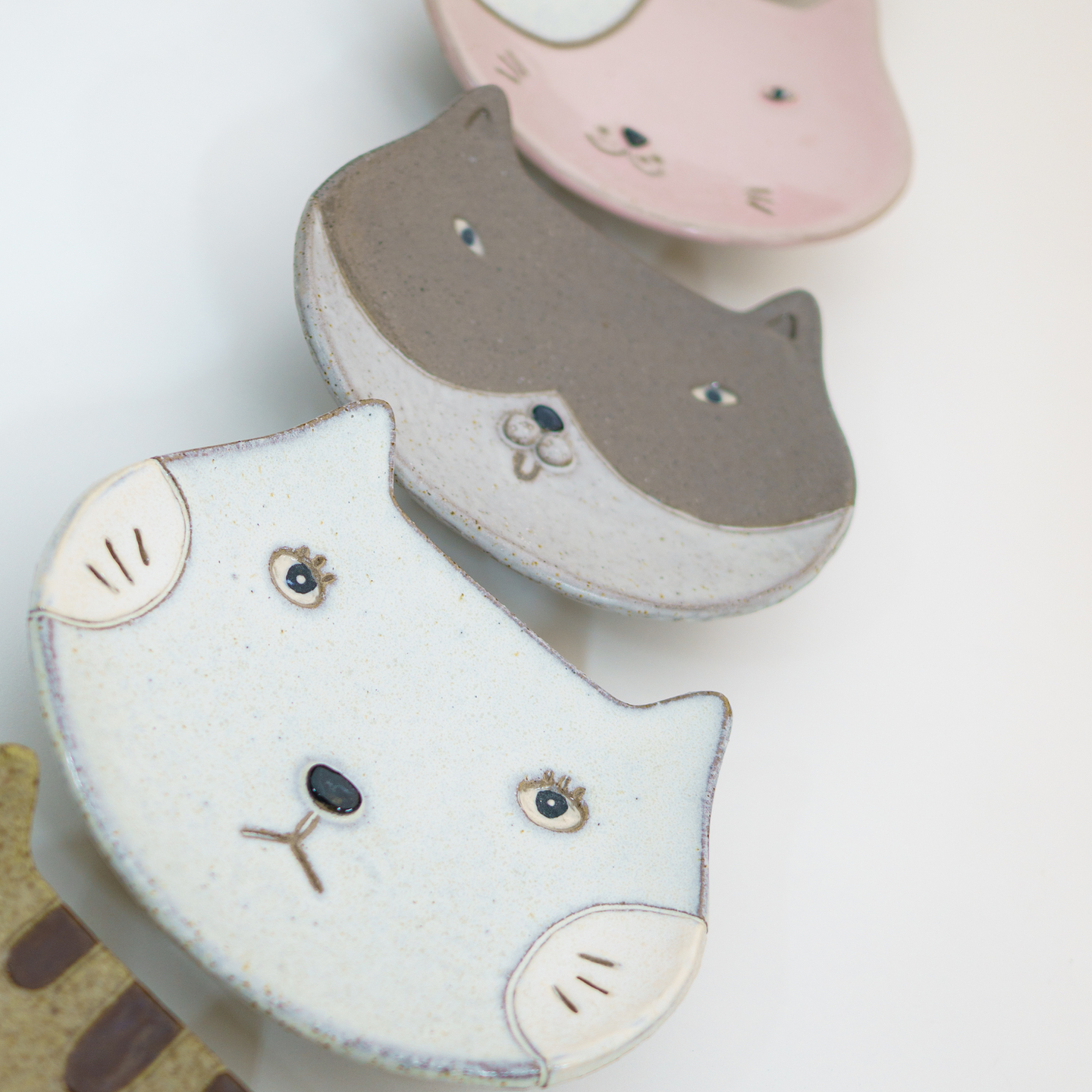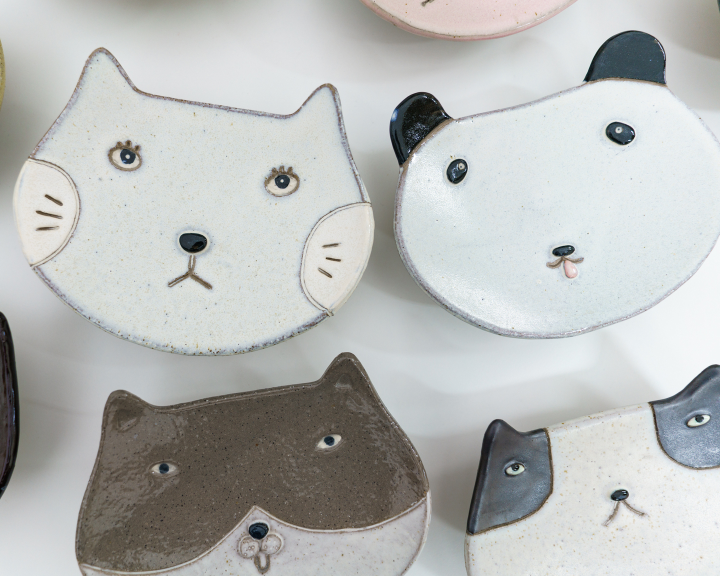 ねこ皿の最大のポイントは、釉薬の重ね掛けや掛け分けといった、複雑な工程の仕上げが7種類から選べます!同じ顔つきで作っても、違うネコになります
